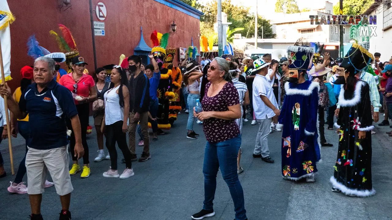 En la calle Vicente Guerrero la comparsa avanza por el cuartel general de Emiliano Zapata y la gente del pueblo se va sumando al baile de con los sones de chinelo en el sábado de convite en Tlaltizapán.