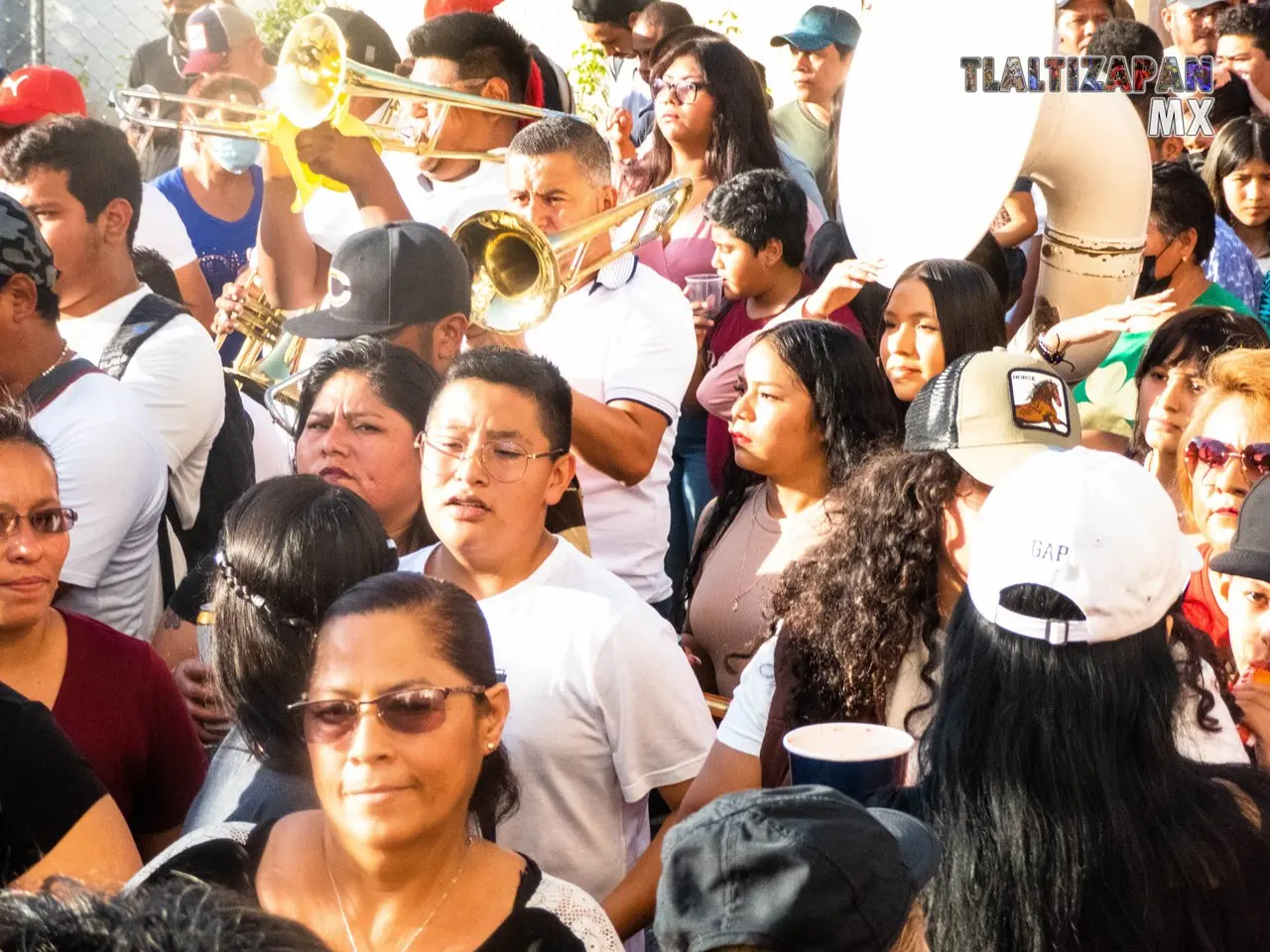 La banda de viento en medio de la comparsa en Tlaltizapán.