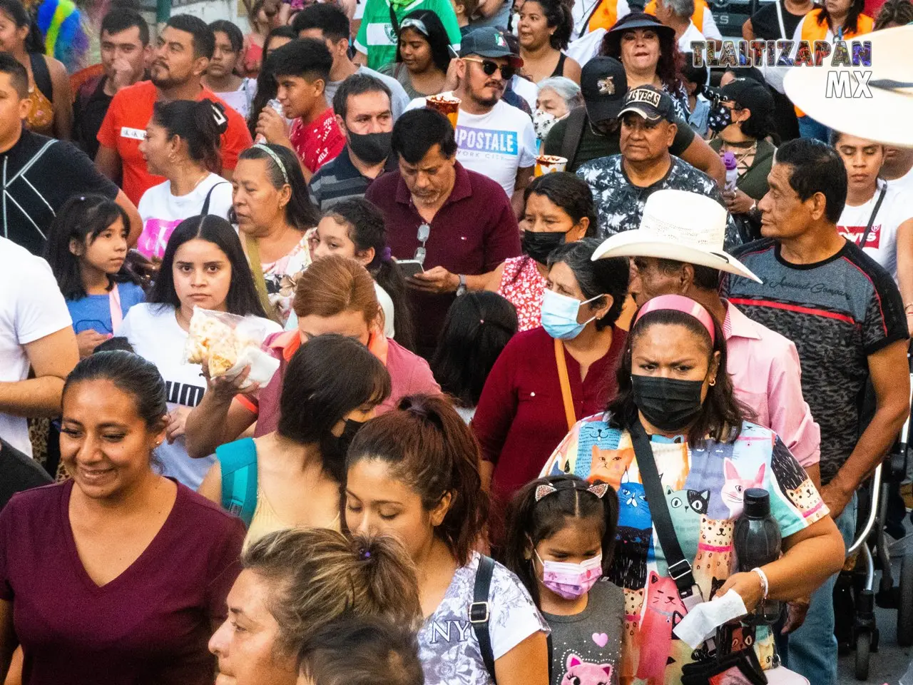 People advancing to the sound of the chinelo on Vicente Guerrero Street during the traditional route to celebrate the third treat, third and last notice prior to the Tlaltizapán 2023 carnival.
